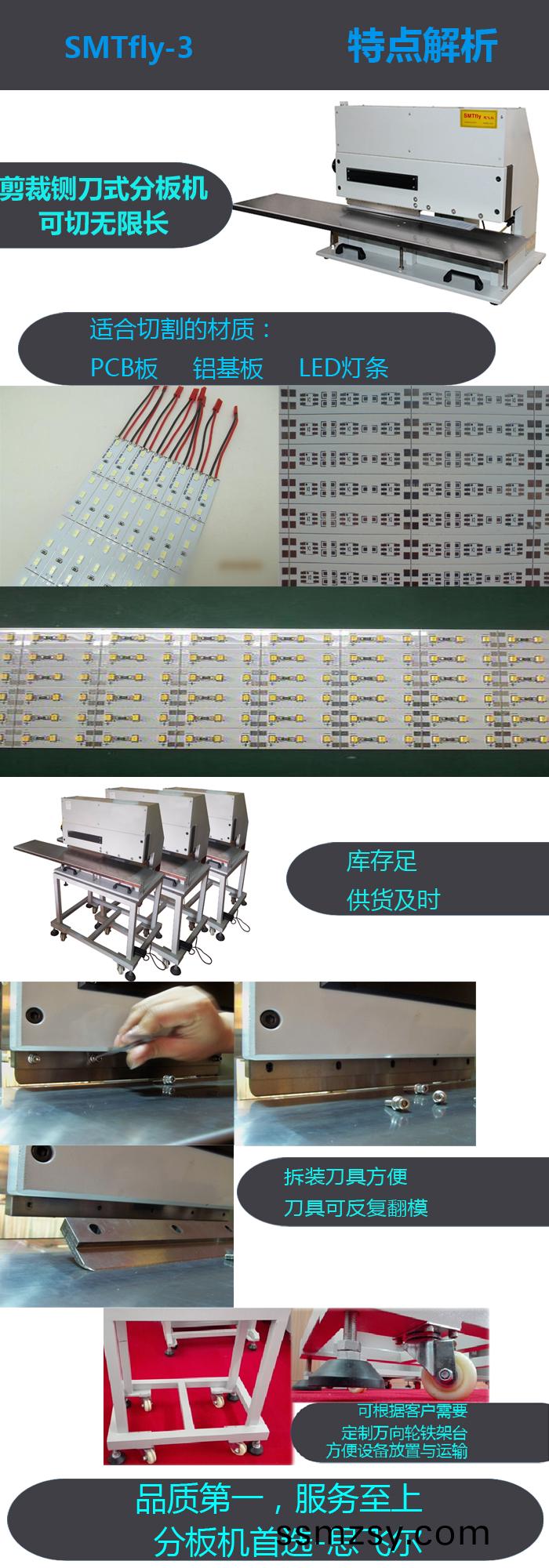 ●適(shi)用(yong)於(yu)各(ge)種PCB闆,鋁(lv)基闆(ban),氣動(dong)式設計,無剪(jian)切(qie)應力(li),特彆(bie)適(shi)用(yong)于分(fen)割精密SMD薄闆,鋁(lv)基闆(ban)等.